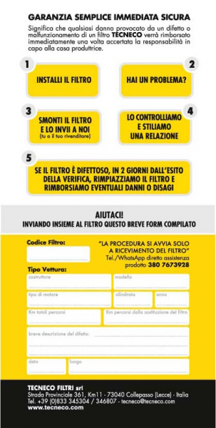 Garanzia semplice, immediata, sicura, significa che qualsiasi danno provocato da un difetto o malfunzionamento di un filtro TECNECO, verrà rimborsato immediatamente una volta accertata la responsabilità in capo alla casa produttrice.