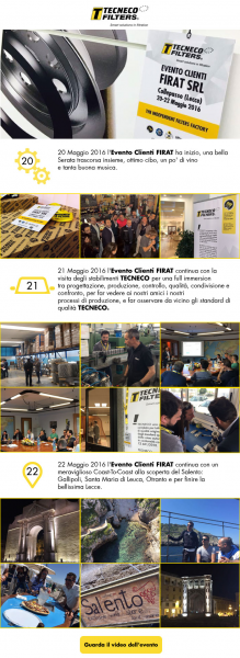 3 giorni dell'evento clienti organizzato in collaborazione con FIRAT AUTORICAMBI/Gianico (Brescia), che ha portato in visita presso i nostri stabilimenti di Collepasso (Lecce) 15 clienti per mostrargli i nostri processi di produzione e osservare da vicino gli standard di qualità TECNECO. In più questa è stata un'ottima occasione per far visitare ai nostri amici la nostra terra, il Salento.