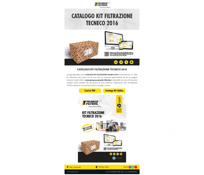 Disponibile il nuovo programma KIT FILTRAZIONE 2019 con 91 codici Kit in totale e ben 19 nuovi codici Kit 2019. I 91 codici Kit raggruppati in questo catalogo sono solo un campione rappresentativo dei Kit di maggiore rotazionein in relazione alle vetture più diffuse del parco auto Italiano. Su www.tecneco.com/p/kit_filtri.htm è disponibile un catalogo online facilmente consultabile, dove mettiamo a disposizione tutti i Kit Filtrazione disponibili della gamma TECNECO e NISHIBORU.