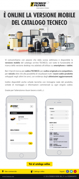 Disponibile il nuovo Filters Compact 2019/2020, tutta la nostra gamma prodotti in un unico strumento. Il Filters Compact nasce con l'intento di unire in un unico strumento tutta la gamma prodotti TECNECOFILTRATION, mettendo a disposizione dei nostri Clienti informazioni tecniche e commerciali puntuali, aggiornate e precise.