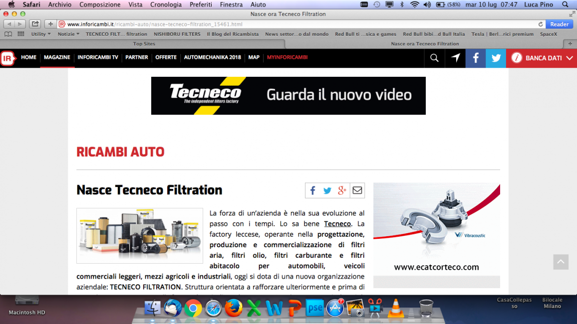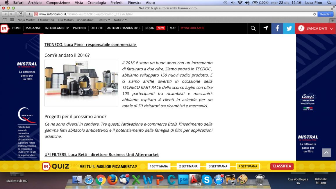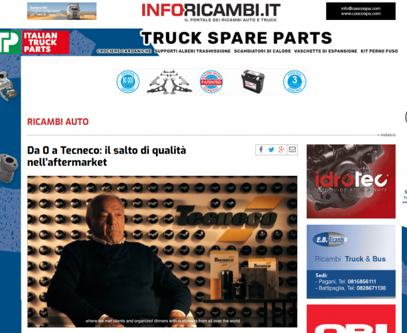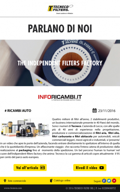 Su INFORICAMBI un bell'articolo su Antonio Pino, l'uomo che nel lontano 1967 ha fondato la nostra Azienda. Un interessante approfondimento nel quale si racconta da dove è nata l'idea di fondare una fabbrica di produzione filtri per automobili, e le difficoltà affrontate per portare avanti il progetto, fino ad arrivare ad oggi. Interessante anche il link diretto al video integrale "Da 0 a TECNECO".