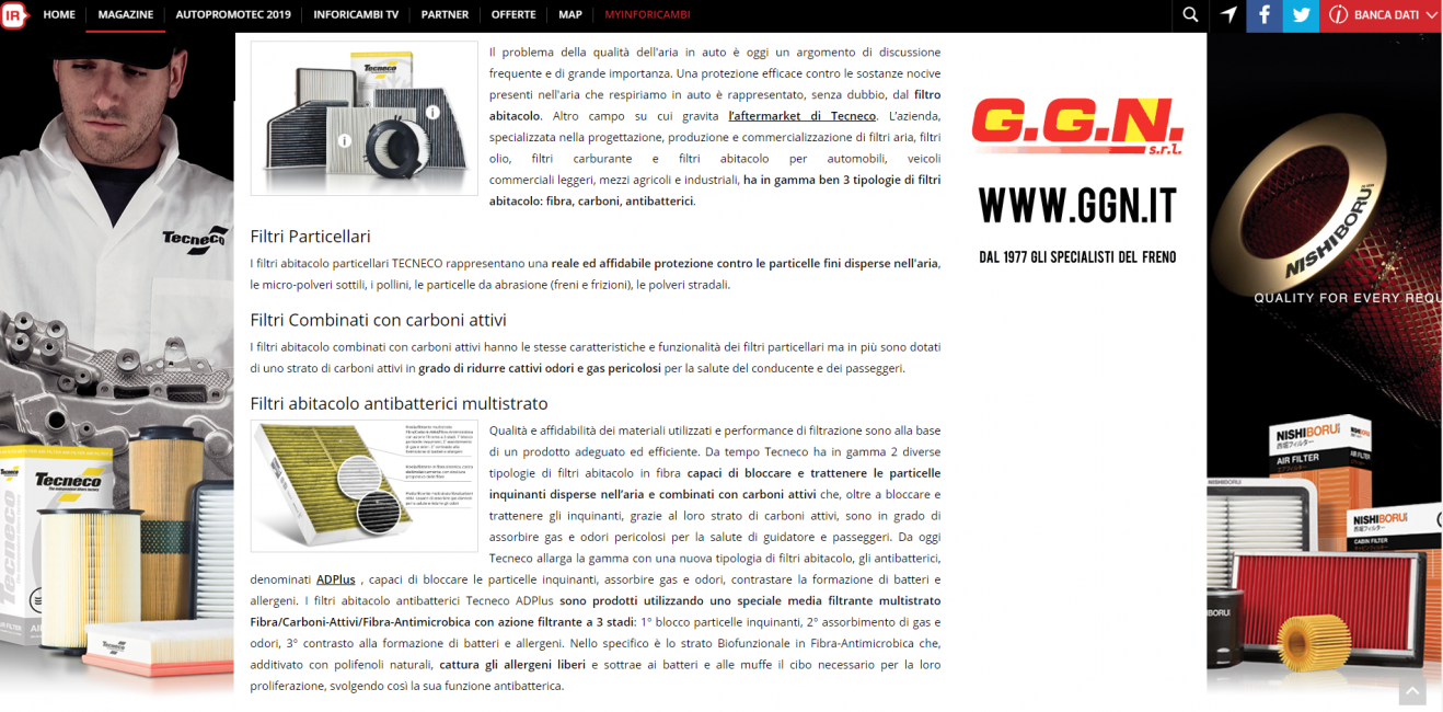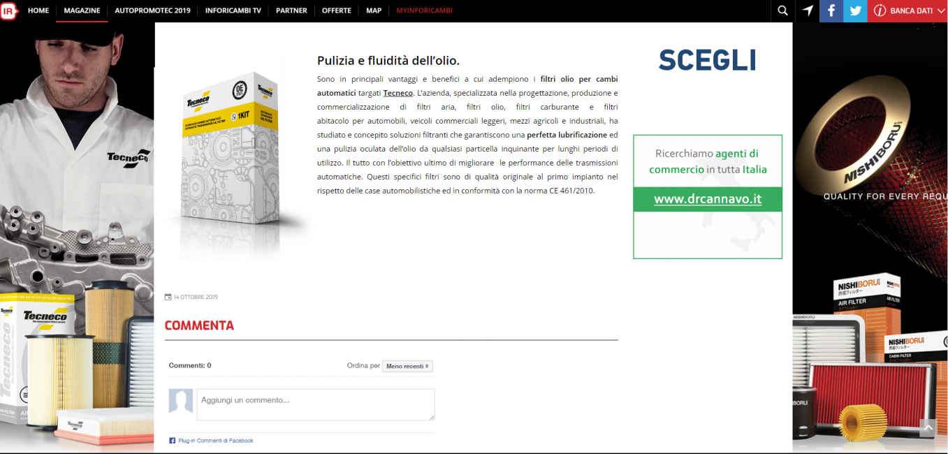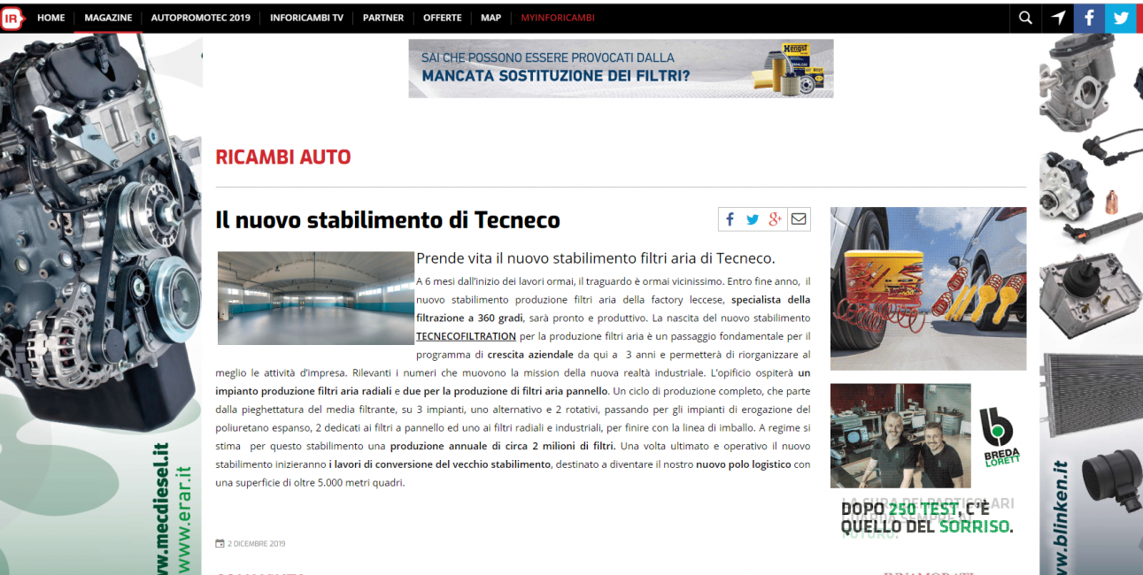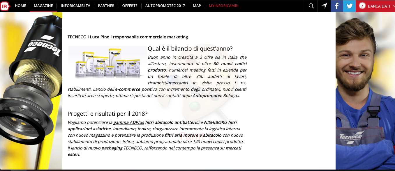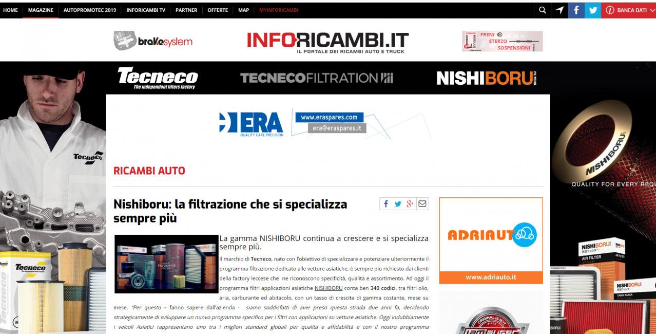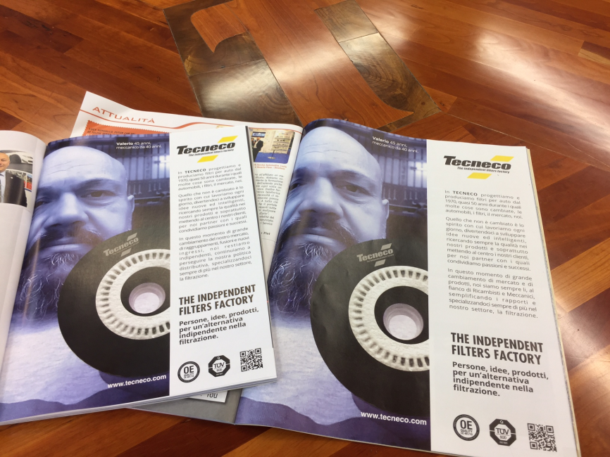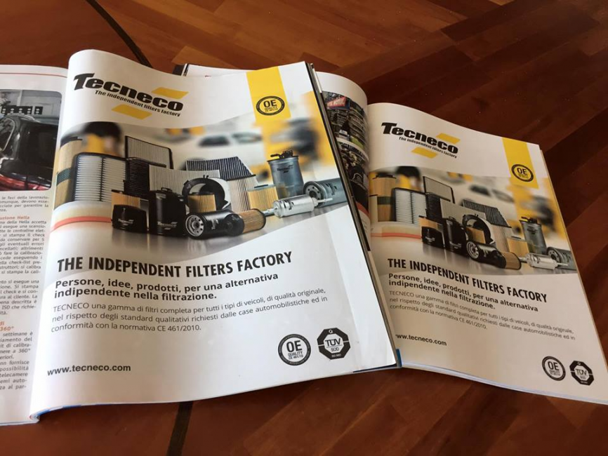 A Gennaio e Febbraio 2019 due nuove pagine pubblicitarie dedicate ai prodotti TECNECO e NISHIBORU sulle riviste di settore Il Giornale dell'Aftermarket ed Il Giornale del Meccanico. La prima, sul Giornale dell'Aftermarket è dedicata al brand NISHIBORU, per presentare agli operatori del settore il nuovo brand specifico per la filtrazione vetture asiatiche. La pagina pubblicitaria dedicata al brand TECNECO, pubblicata sul Giornale del Meccanico, ha invece un taglio più tecnico e richiama l'attenzione sulla qualità dei filtri prodotti, garantita da centinaia di test di laboratorio e continui controlli in linea.