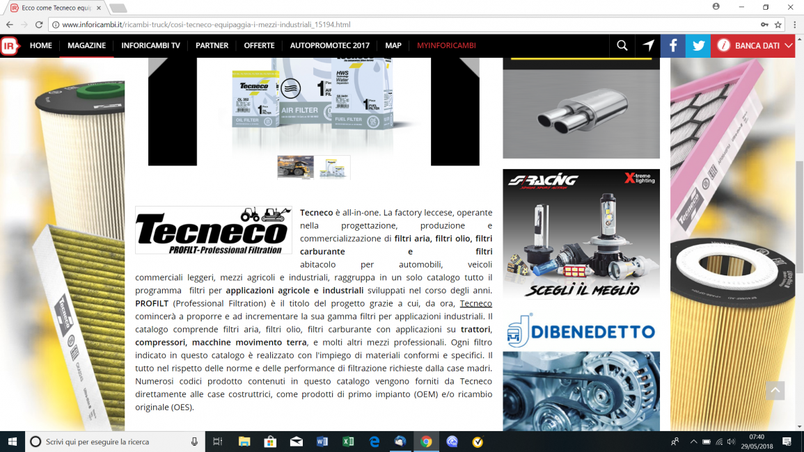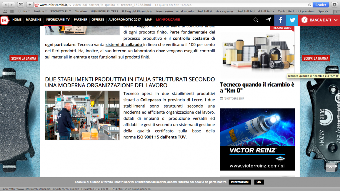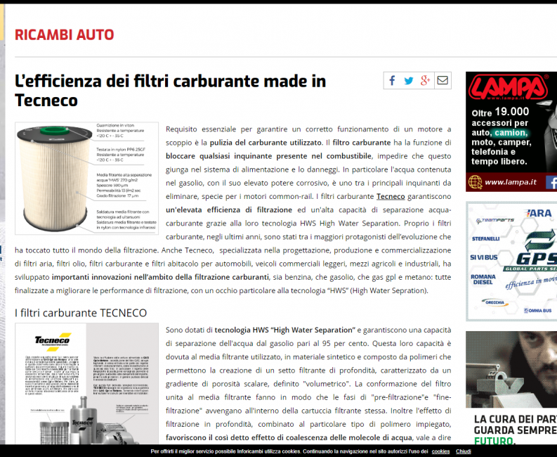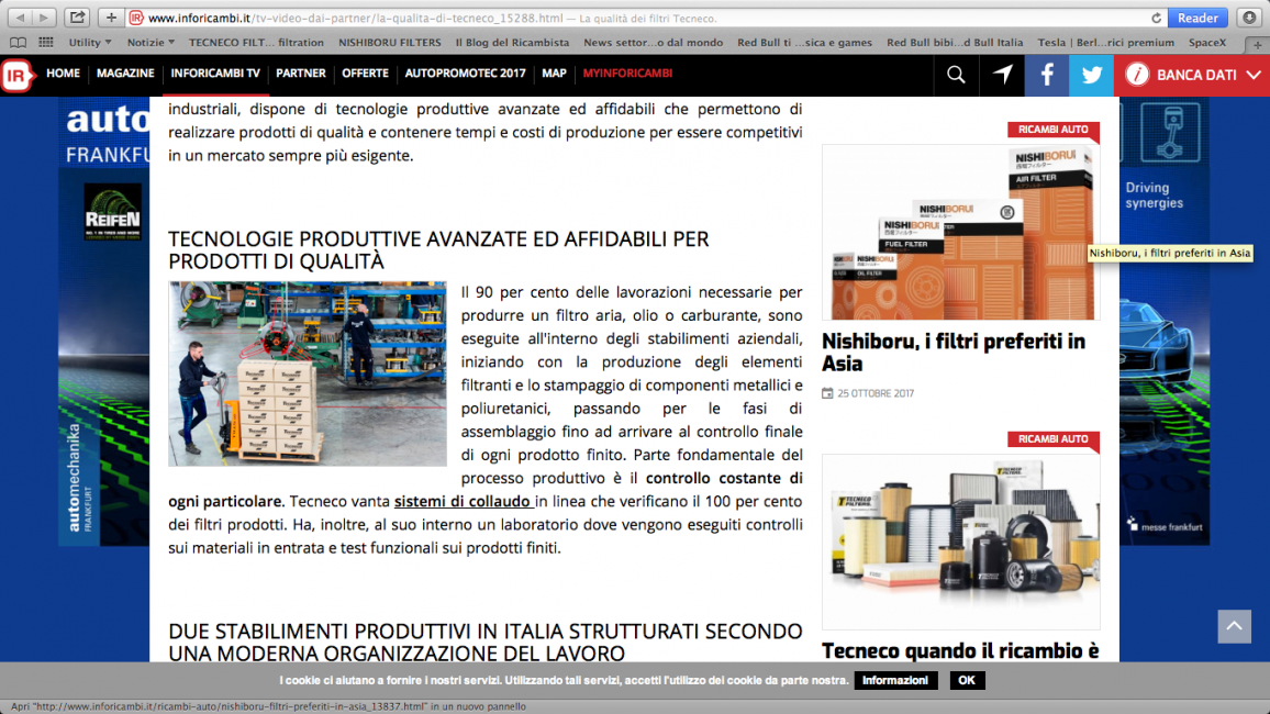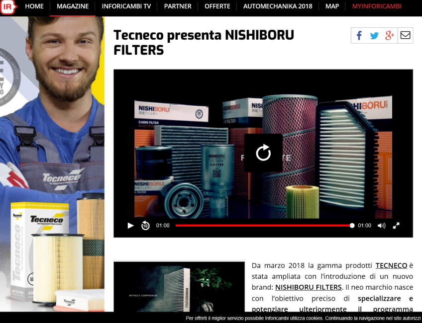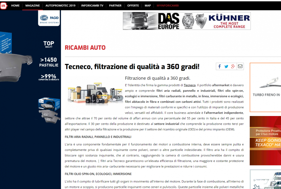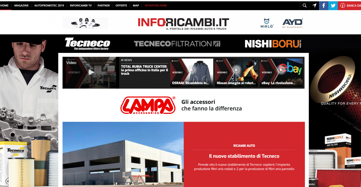 A Gennaio e Febbraio 2019 due nuove pagine pubblicitarie dedicate ai prodotti TECNECO e NISHIBORU sulle riviste di settore Il Giornale dell'Aftermarket ed Il Giornale del Meccanico. La prima, sul Giornale dell'Aftermarket è dedicata al brand NISHIBORU, per presentare agli operatori del settore il nuovo brand specifico per la filtrazione vetture asiatiche. La pagina pubblicitaria dedicata al brand TECNECO, pubblicata sul Giornale del Meccanico, ha invece un taglio più tecnico e richiama l'attenzione sulla qualità dei filtri prodotti, garantita da centinaia di test di laboratorio e continui controlli in linea.