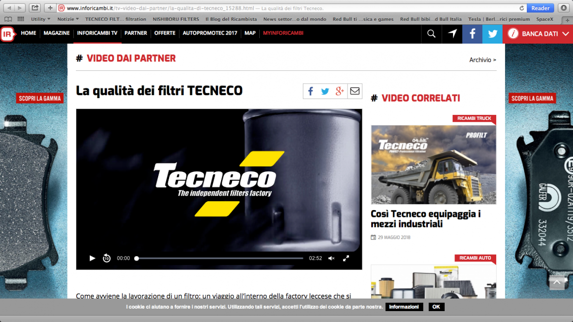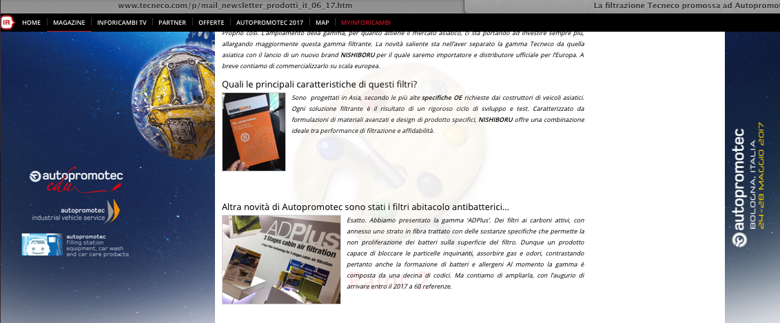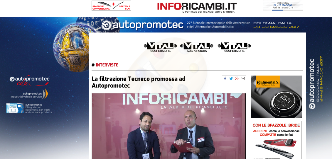 Questo sotto il link diretto al video ufficiale realizzato dal portale INFORICAMBI sulla partecipazione TECNECOFILTRATION all'ultima edizione della fiera AUTOPROMOTEC di Bologna, tenutasi lo scorso mese di Maggio. Buona visione.