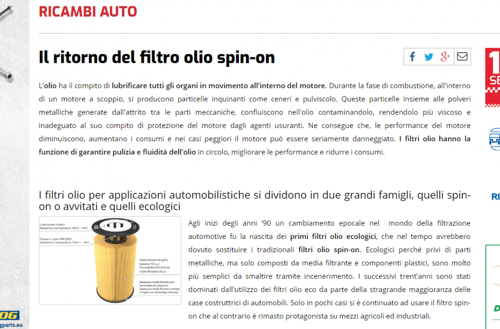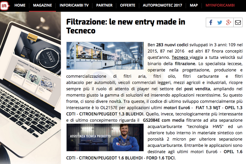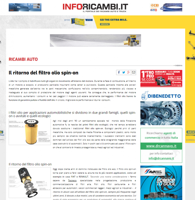 Su INFORICAMBI, il portale Italiano dell'Automotive Aftermarket, un bell'articolo sui filtri olio, sviluppato in collaborazione con noi di TECNECOFILTRATION. Molto interessante e completo, analizza il funzionamento dei filtri olio spin-on ed ecologici e racconta l'evoluzione negli anni di uno tra i prodotti più venduti del nostro settore.