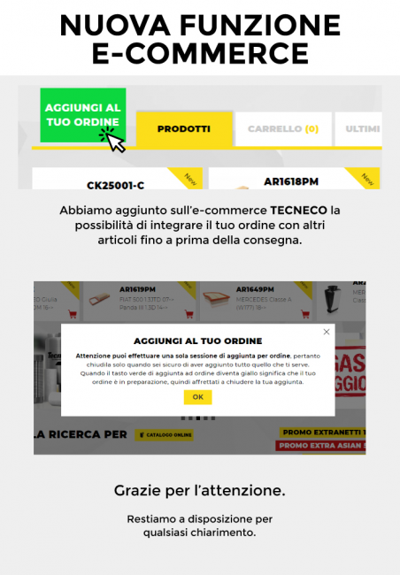 Nel nostro piccolo crediamo oggi più che mai nell'importanza della giusta informazione tecnica diretta all'Installatore. Per questo con l'aiuto dei nostri Clienti Ricambisti, abbiamo pensato di creare una banca dati con gli indirizzi mail di Meccanici/Installatori loro Clienti, cui inviare direttamente report tecnici e aggiornamenti prodotto. Siamo certi che questo servizio migliorerà le relazioni e la collaborazione tra Produttore, Rivenditore ed Installatore.